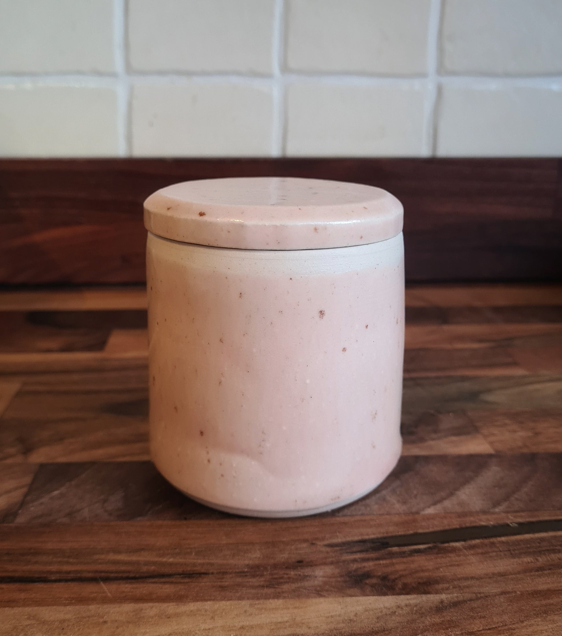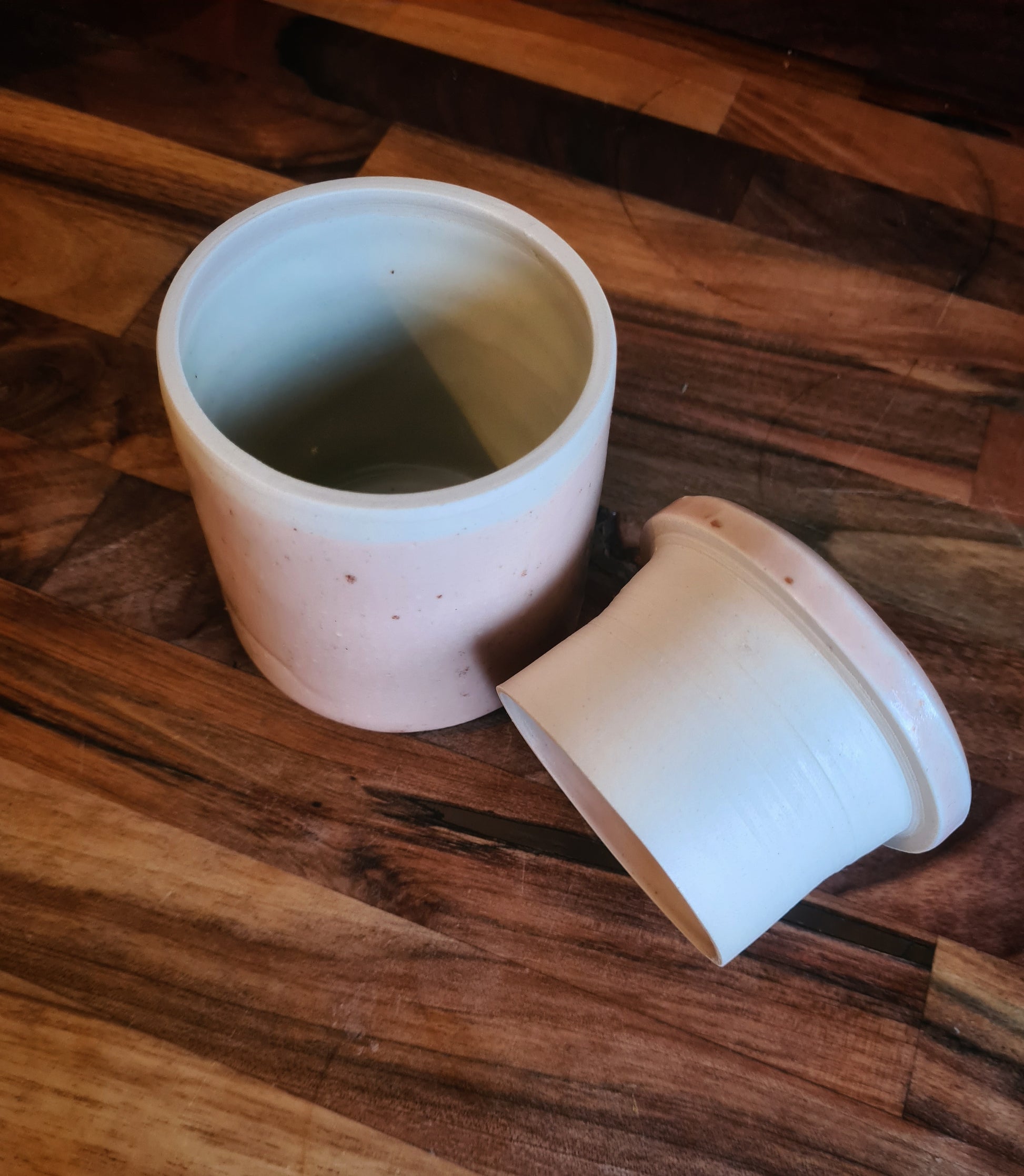 Made from stoneware clay, with the top being warped in the kiln, but not affecting functionality.
